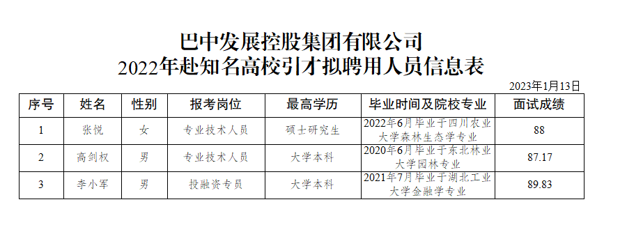 巴中發(fā)展控股集團(tuán)有限公司關(guān)于2022年赴知名高校引才擬聘用人員的公示